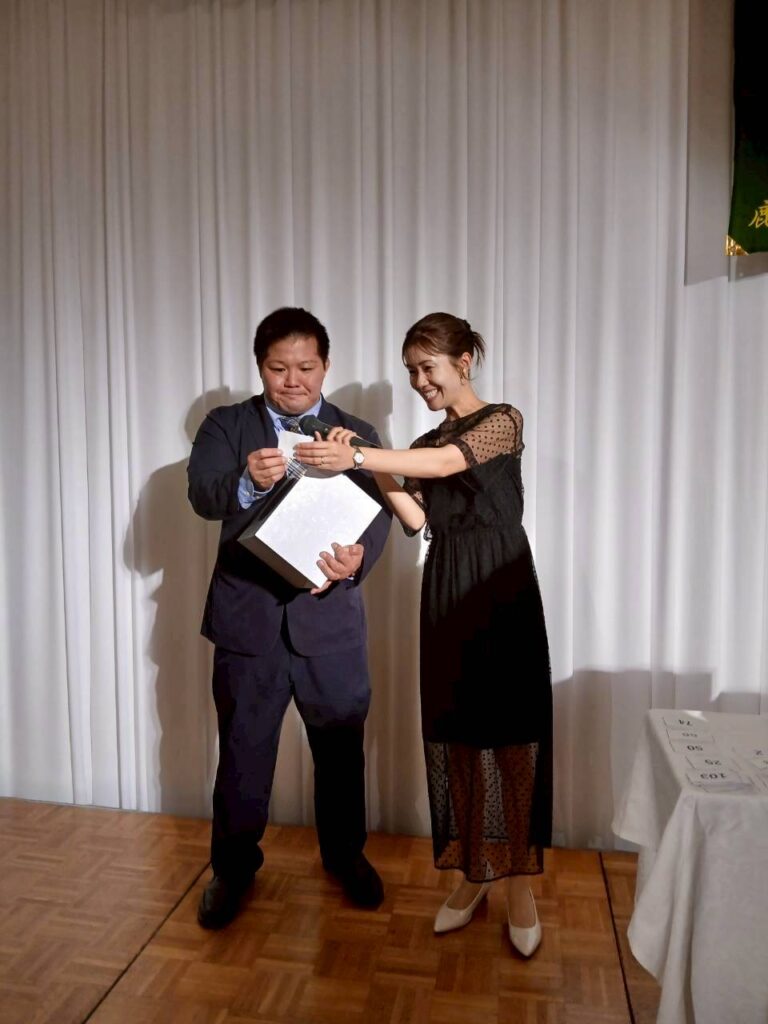 余興では、本校部活動生が自作した部活動紹介オリジナルムービーを放映後、司会進行を務めてくださったタレントの上妻さんと安田先生で抽選大会を行い約50個の景品を廻って大盛況となりました。