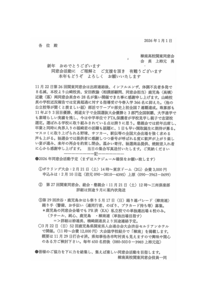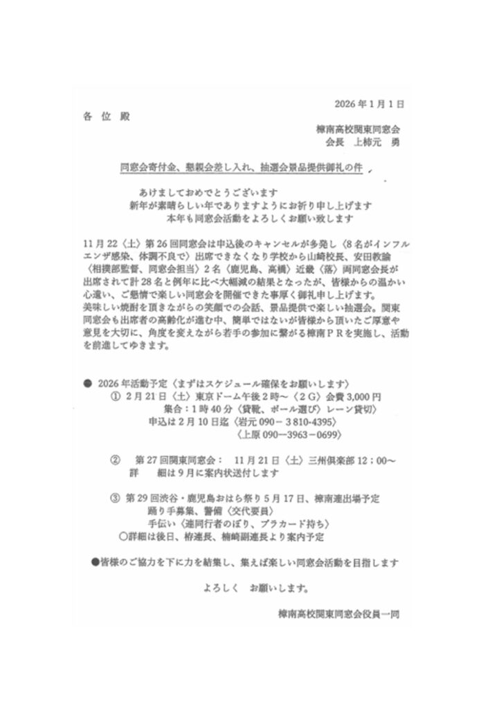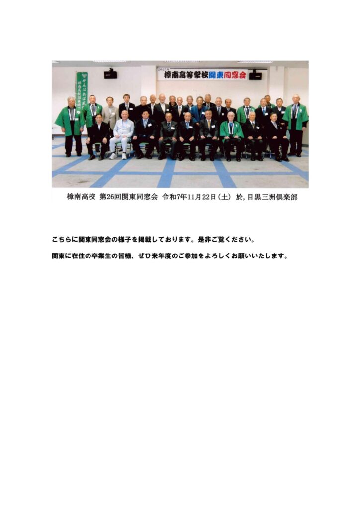 樟南高等学校関東同窓会より、令和7年11月22日土曜日に東京都目黒区にある「三州倶楽部」にて「第26回 樟南高等学校 関東同窓会」の総会ならびに懇親会についてのご報告です。