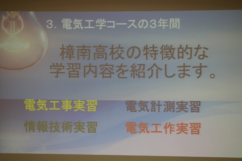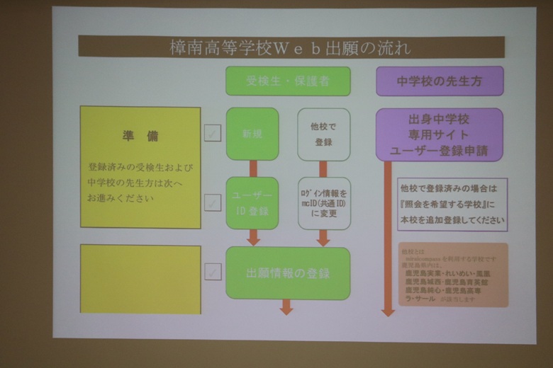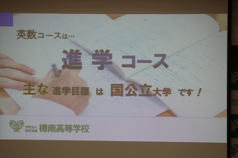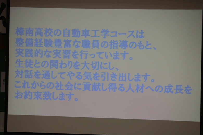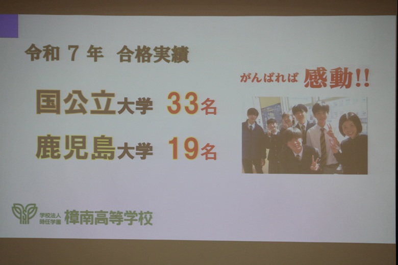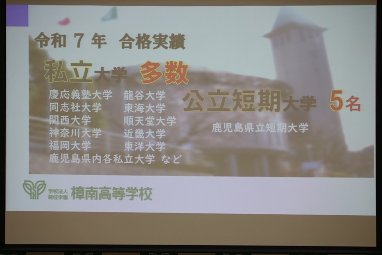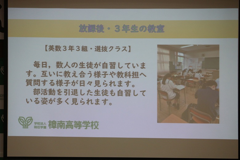 説明会の進行を終始見守っておりました。先生方が本校の説明内容に傾聴される様子や、終了後に書いていただいたアンケート等を拝見するにつけ、やはり『樟南高校への期待の大きさ』を改めて、ひしひしと感じるところでした。生徒一人ひとりの可能性を最大限に伸ばす教育を目指していくことを確認しました。本校ではこれからも、中学校・塾の先生方と協力しながら、生徒の未来を支える教育環境づくりに努めてまいります。中学校や学習塾において、先生方から中学生の皆さんへ各科・コースの魅力を伝えていただければ幸いです。