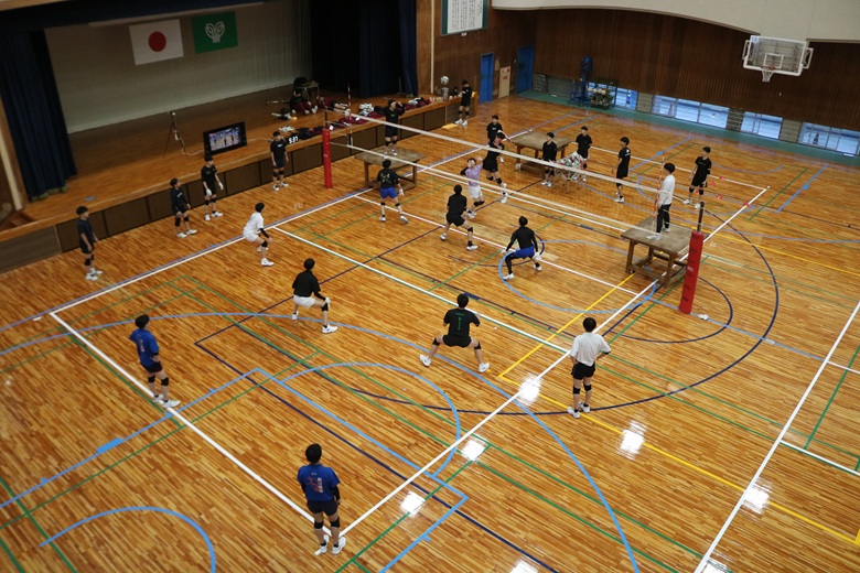 今日の放課後は、男子バレー部と男子バスケットボール部が新しい床で練習中。バレー部のスパイクが決まるたび、ボールの軌道が床に反射して一層迫力が増します。