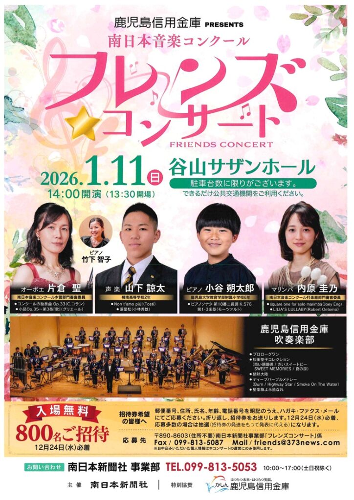2026年1月11日(日)に開催される「南日本音楽コンクール フレンズコンサート」に、本校文理コース2年の山下 諒太君が、声楽として出演します。