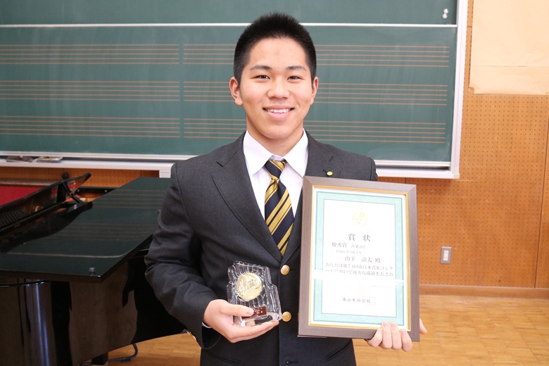 山下君は声楽部門において見事優秀賞を受賞し、グランプリ選考会へ出場しました。残念ながら今回はグランプリ受賞には至りませんでしたが、その実力と表現力が高く評価され、例年、優秀賞受賞者の中から選出されるコンサート出演者に選ばれました。