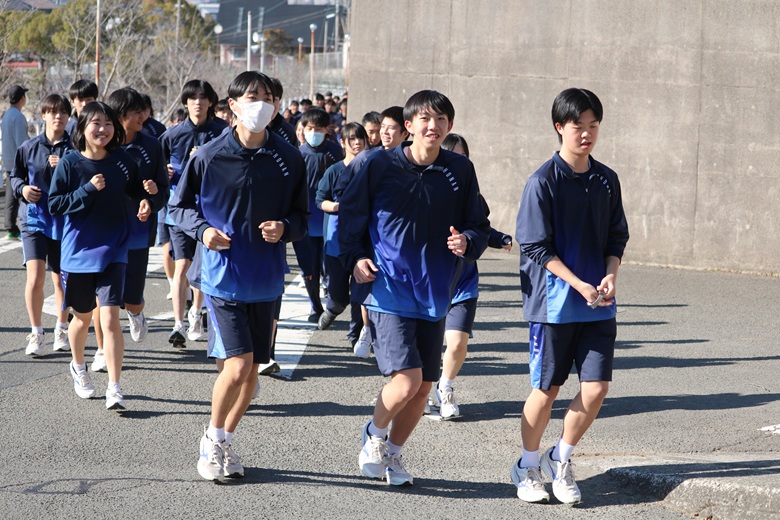 クラスごとの持久走が始まると、ペースを意識しながら仲間と声を掛け合い、まとまりのある走りを見せてくれました。長い校内コースにも関わらず、途中で笑顔を見せる生徒や、互いに励まし合う姿が印象的でした。