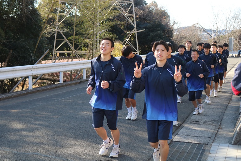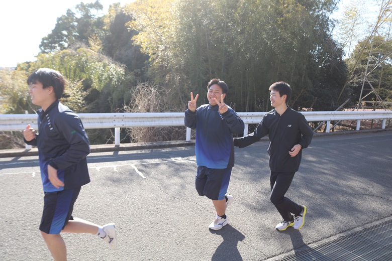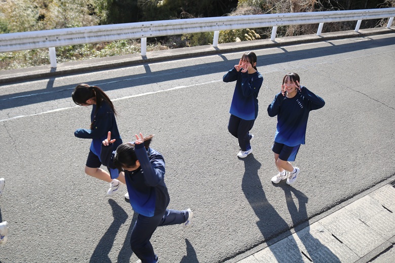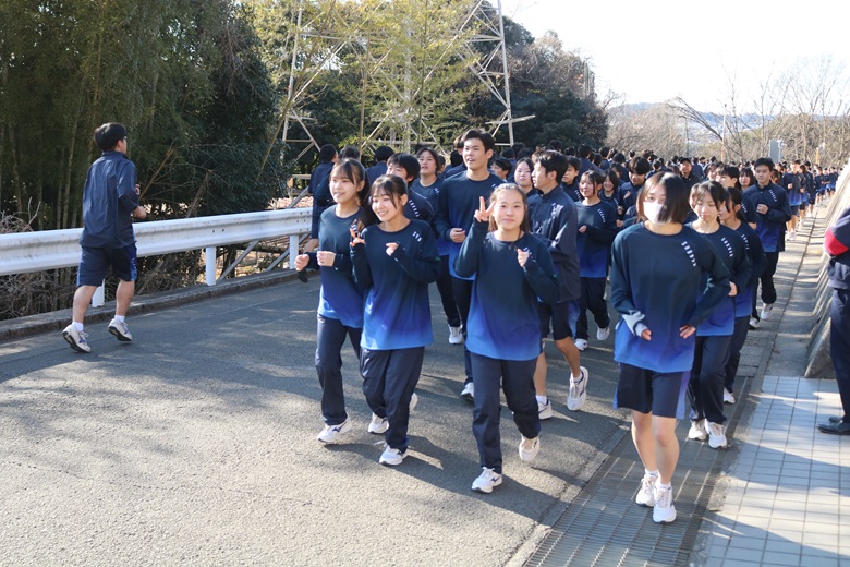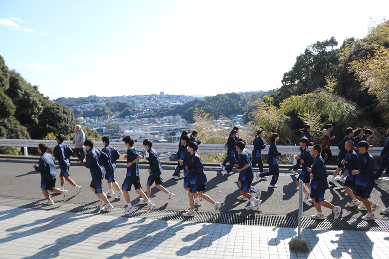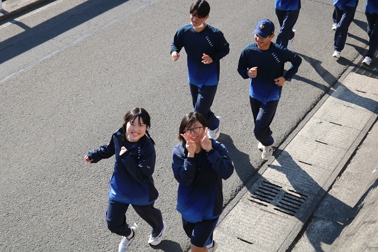 走っている最中にもカメラに気づき、笑顔でピースをする生徒の姿が見られるなど、持久走訓練は終始明るい雰囲気の中で行われ、先生方も生徒と一緒に走りながら声を掛け合い、楽しさと一体感にあふれた時間となりました。緊張感の中にも、楽しそうな表情がたくさん見られ、これから始まる訓練への前向きな気持ちが伝わってきます。