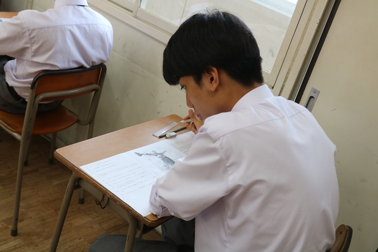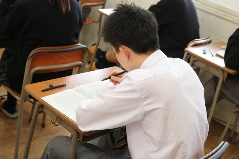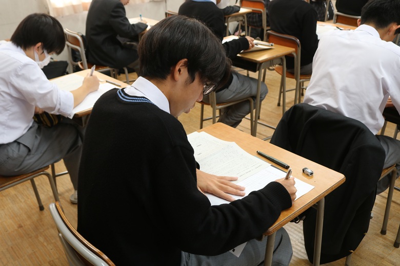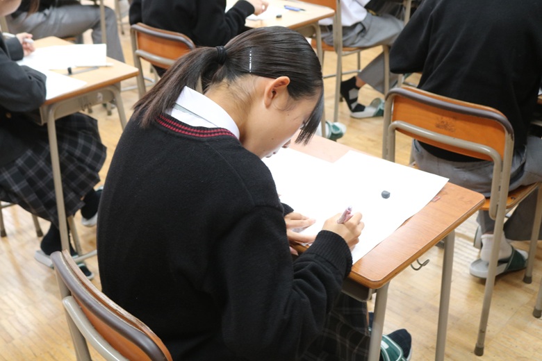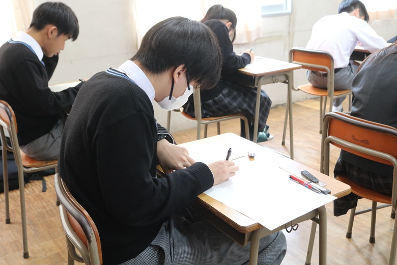2学期の学習内容が幅広く問われる科目で、生徒たちは日頃の取り組みを思い返しながら、丁寧に問題へと向き合っていました。鉛筆の走る音が時折教室に小さく響き、最後の一瞬まで真剣さが途切れることはありませんでした。
