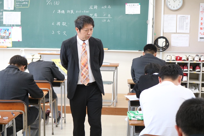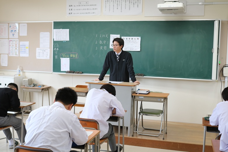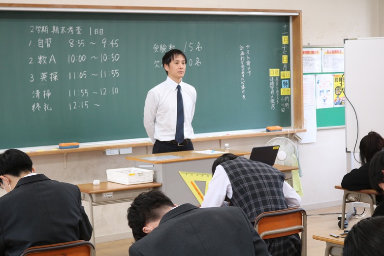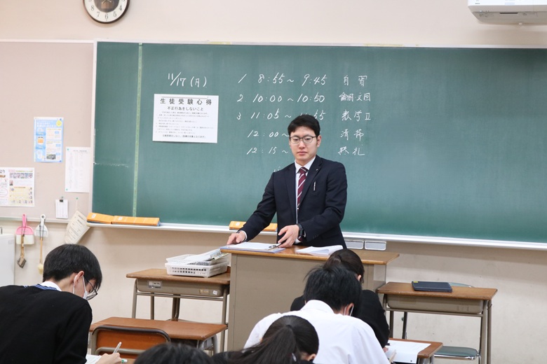 教室前方では、監督を担当する先生が落ち着いた様子で全体を見渡しながら、生徒が集中できる環境を静かに保っています。大きな動きをせず、前方から穏やかに見守る姿勢が、逆に教室全体の緊張をやわらげているようにも感じられました。