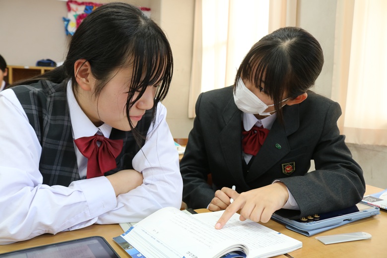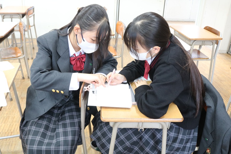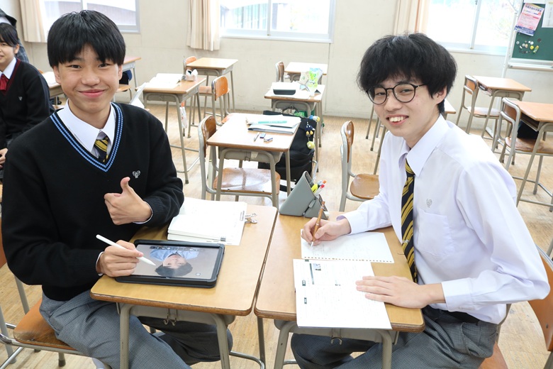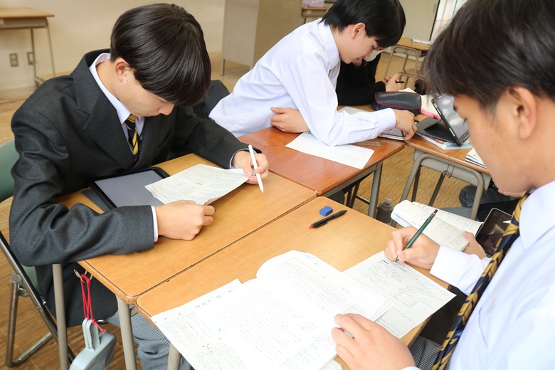 一方、教室では、個人で静かに取り組む生徒に加え、友達と協力しながら学習する姿も印象的でした。分からない問題を相談し合ったり、「この公式はこう覚えるといいよ」と助言し合ったりと、和やかな雰囲気の中にも学びへの真剣さが伝わってきました。