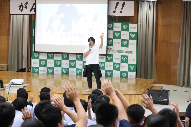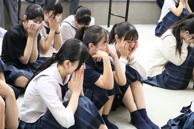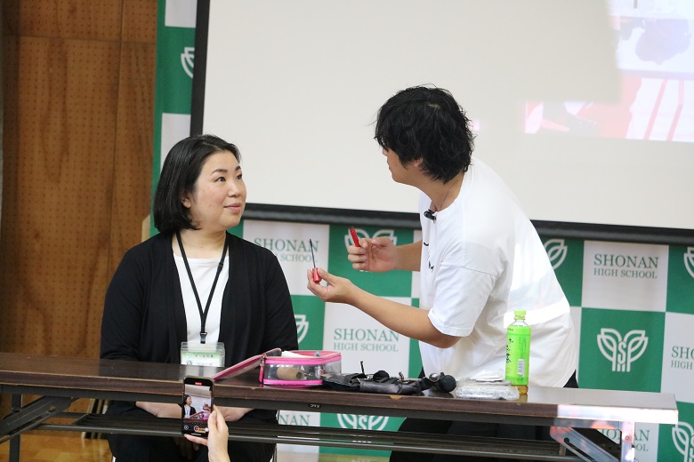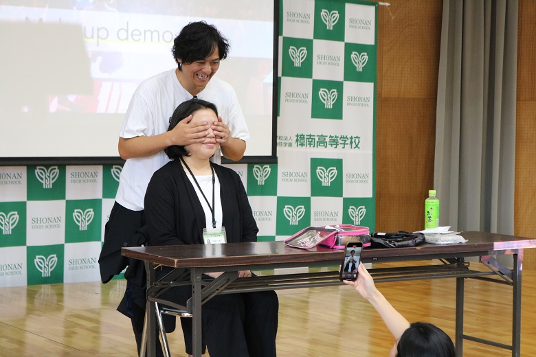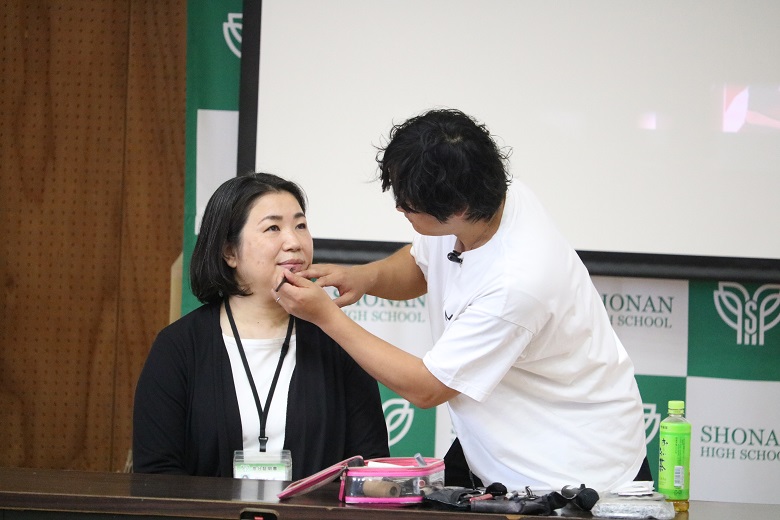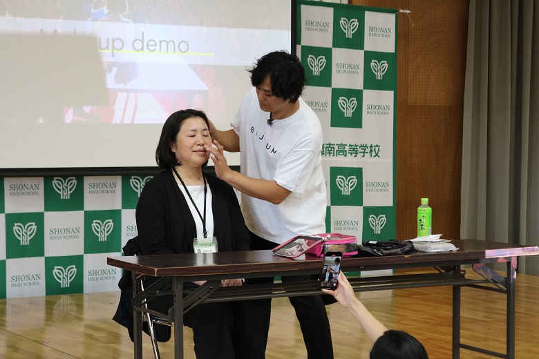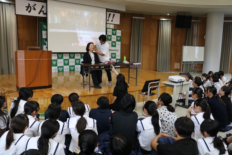 女子生徒は前に出て、プロのメイクを間近で見ようと興味津々の様子でした。