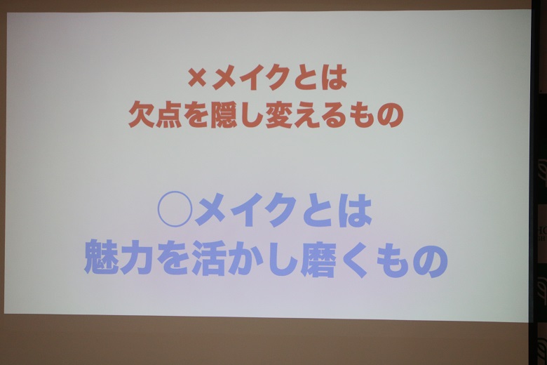 外見や内面の「魅力」に焦点を当て「メイクとは魅力を活かし磨くもの」であるという考え方を強調し、自己肯定感と前向きな人生の創造ができるように促してくれました。