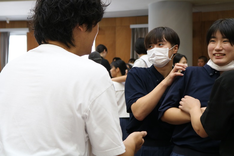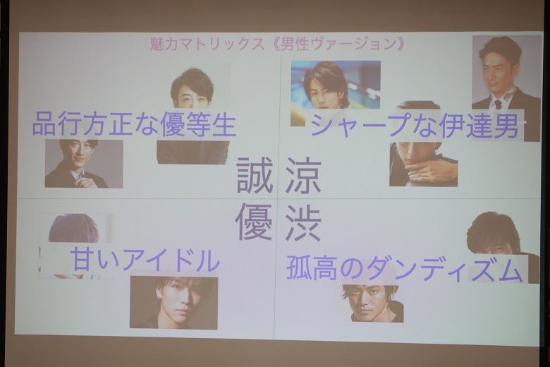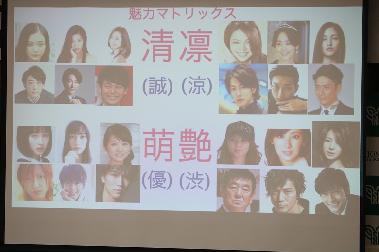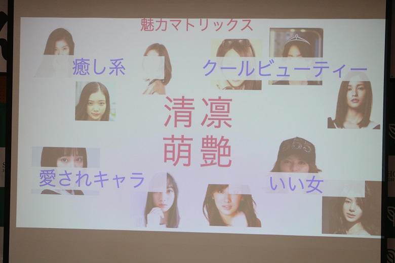 自分の顔の魅力の特質を知るためのツールである『魅力マトリックス』からお互いの顔の種類を言い合うゲーム感覚の時間が設けられました。女性は『凛』『艶』『清』『萌』、男性は『涼』『渋』『誠』『優』の種類の中から、生徒たちは恥ずかしがりながらも相手の顔をどの部類にあてはまるかを言い合いました。お互い言い合うことで自分の顔を意識し興味をもつことができたようです。