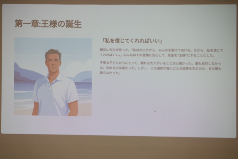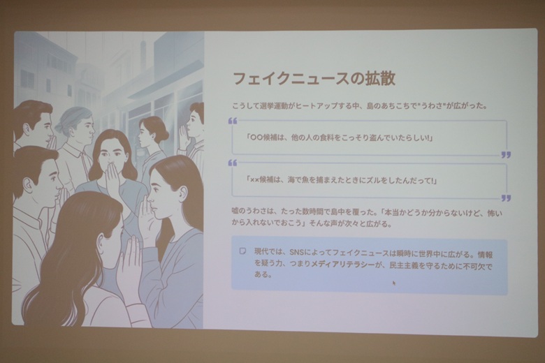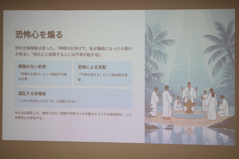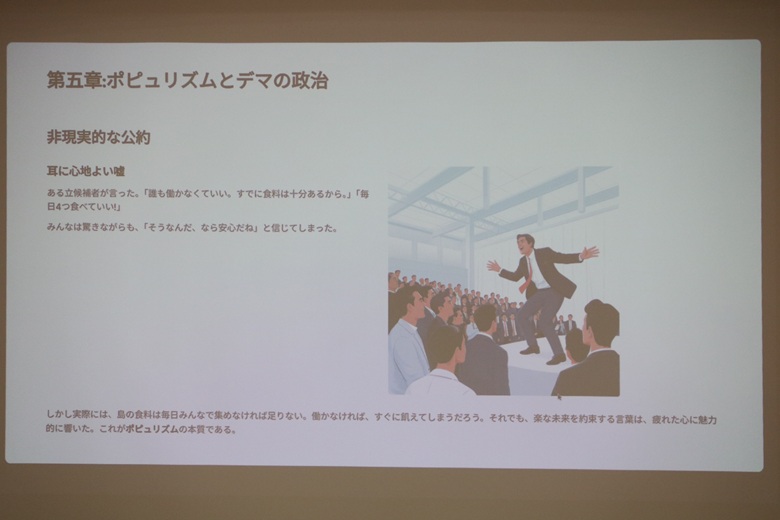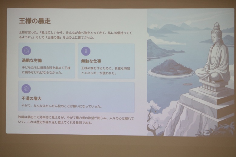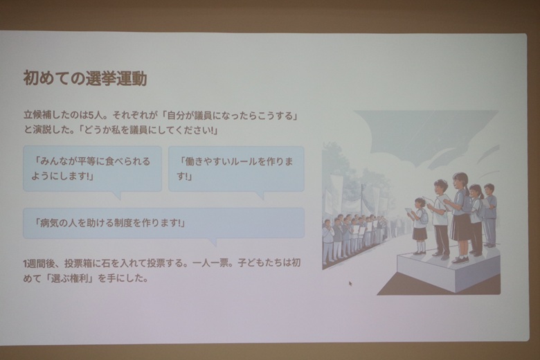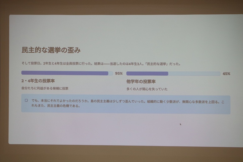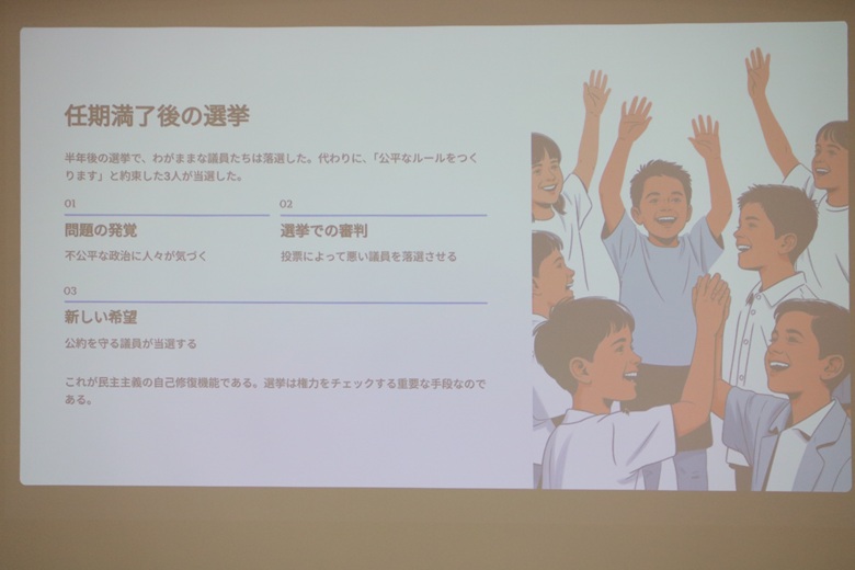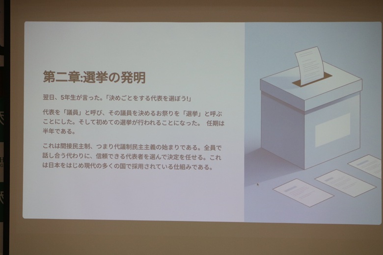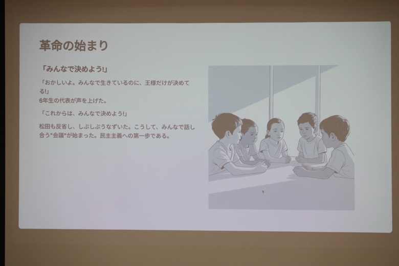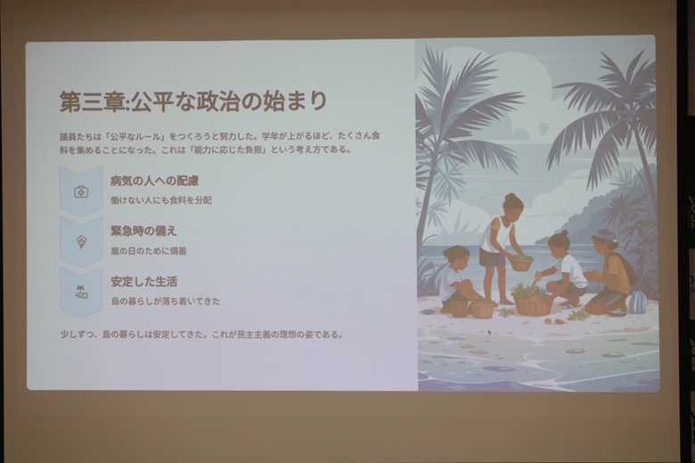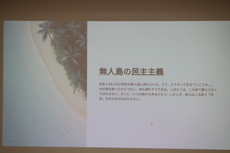 松田先生は「無人島の民主主義」という紙芝居で、民主主義の仕組みを楽しく説明していただきました。