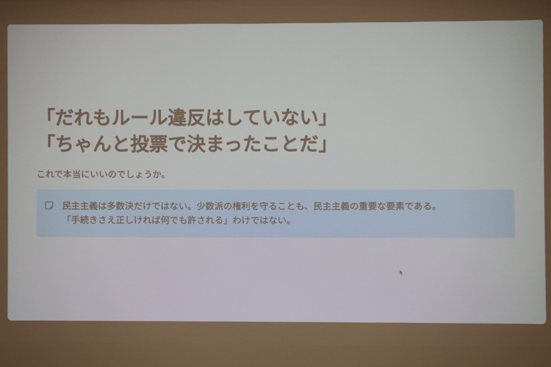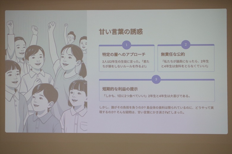 この紙芝居を通して、民主主義にはルールがあっても課題があること、意見をまとめることの難しさを体験できます。