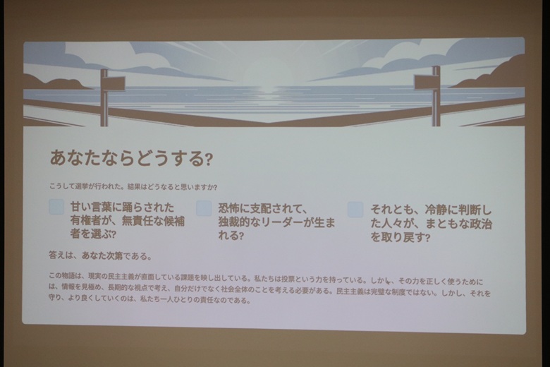 松田先生は「投票に正解はありません。大切なのは、自分の気持ちに沿って意思表示すること。そして、自分の未来に責任を持つことです。」と述べられました。