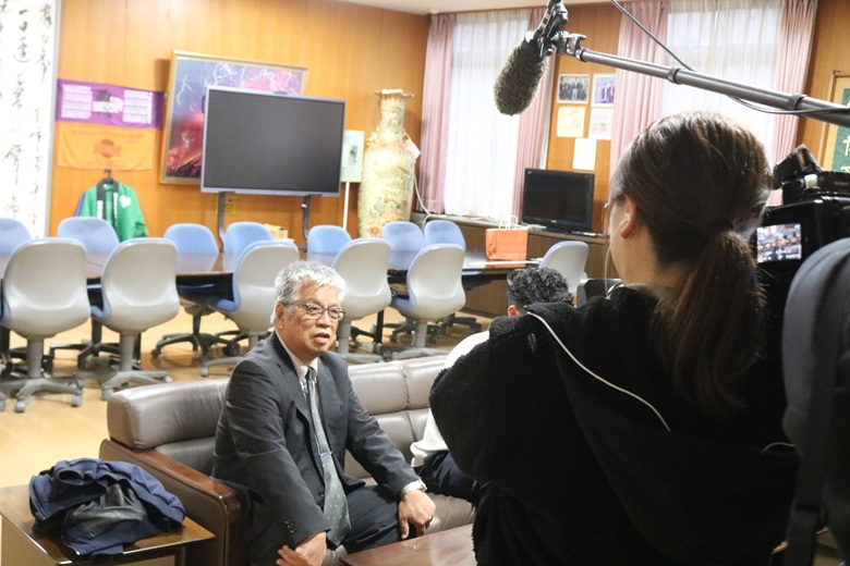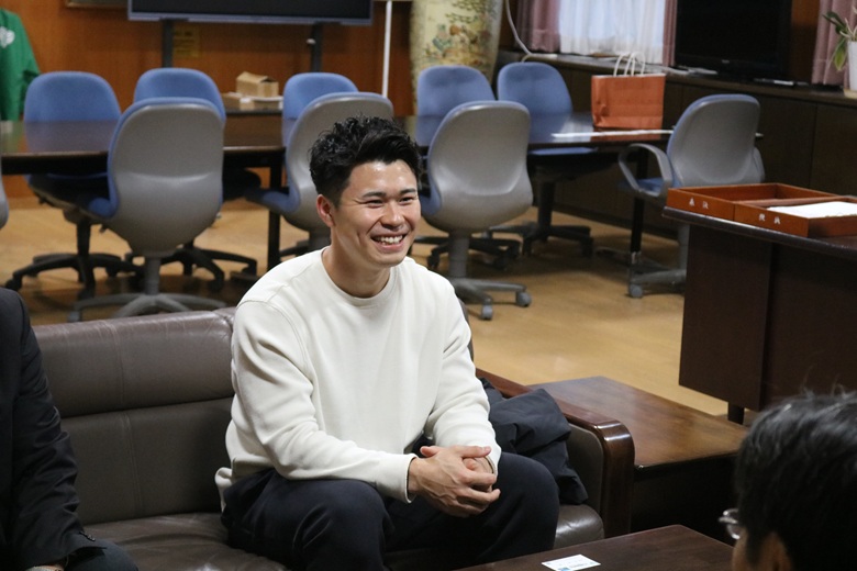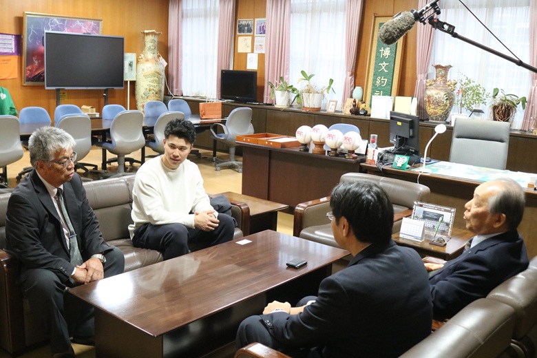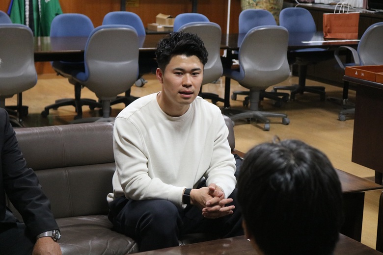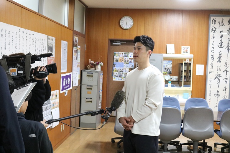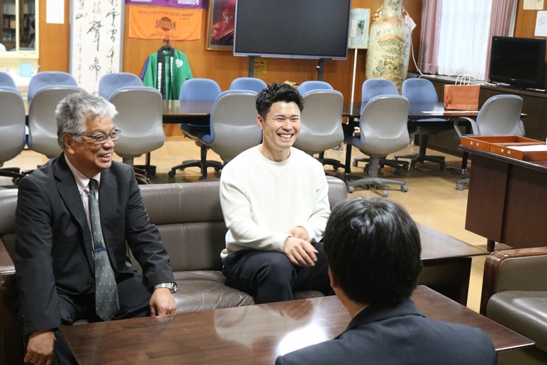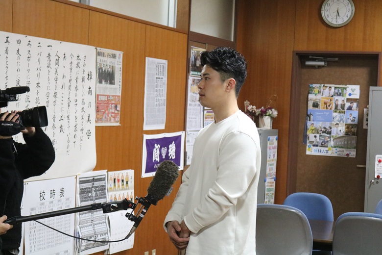 また、これからの意気込みについても語ってくれました。本校の野球部部長の原田 博史先生からは「今の自分に満足せず、これからも努力を重ねてほしい」という激励の言葉を受けると、その言葉をしっかり受け止めてうなずき、さらに成長していこうとする強い姿勢が見て取れました。