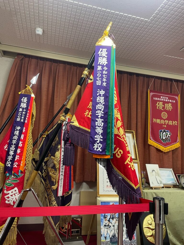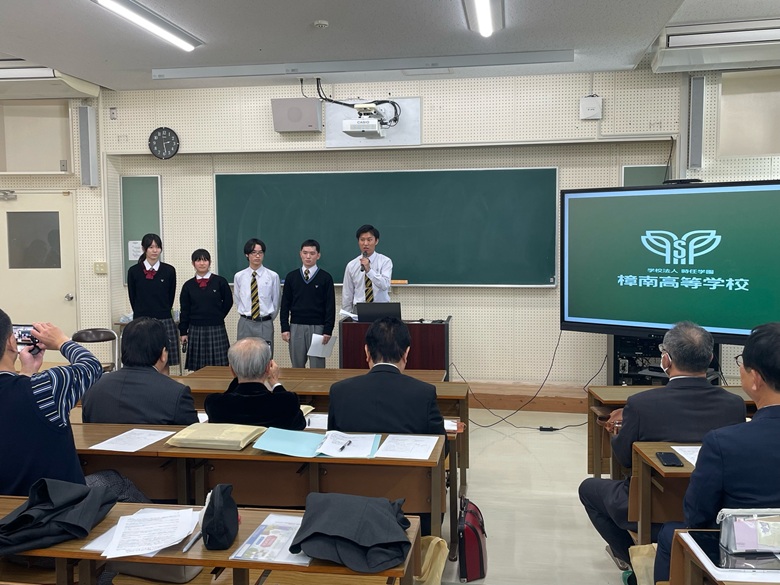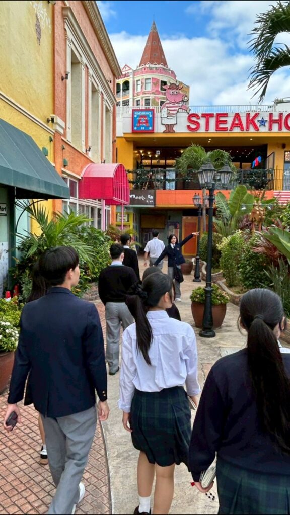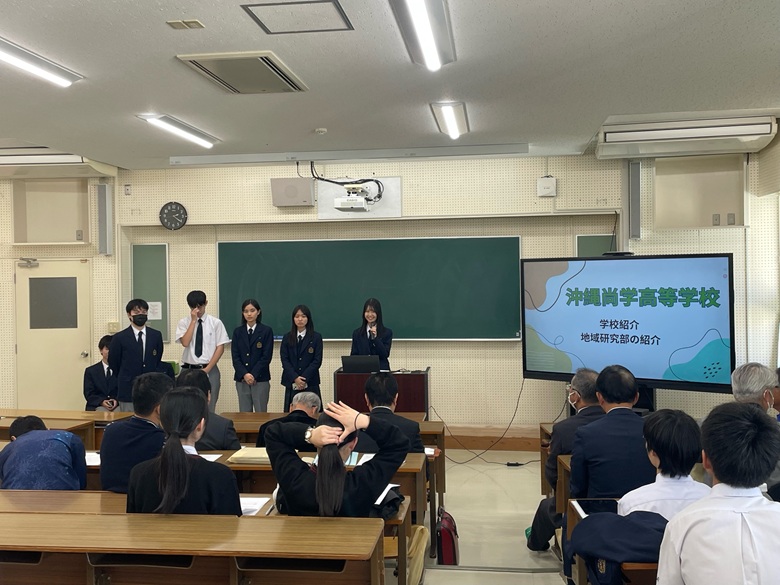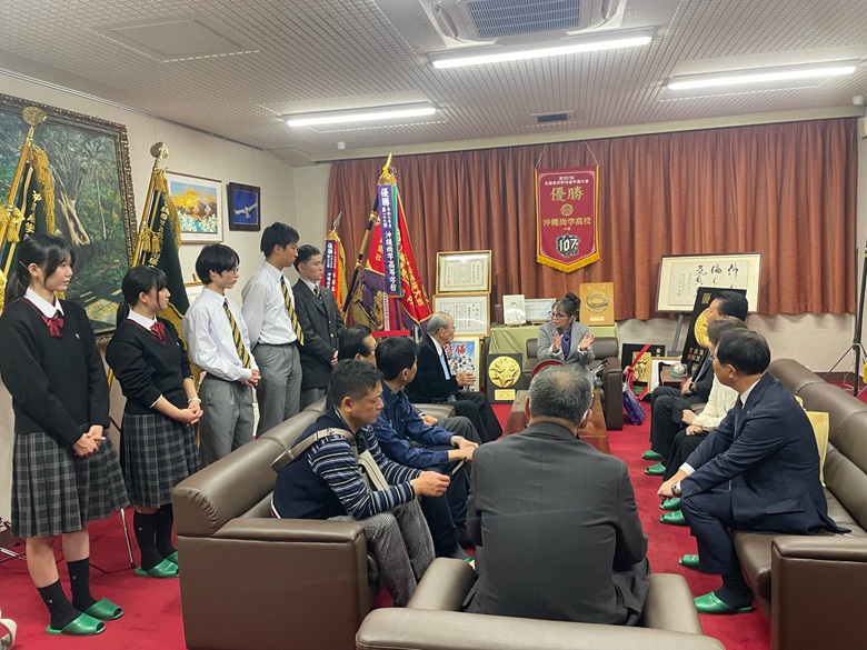 訪問先の沖縄尚学高等学校では、理事長先生へのご挨拶、授業見学、そして本校の学校紹介プレゼンテーションを行いました。大勢の前に立ち、堂々と語る姿。スライドに映し出される写真やデータに込めた想い。緊張で声が震えながらも、最後まで伝え切った達成感は計り知れません。会場からいただいた温かい拍手と「素晴らしい発表でした」という言葉は、生徒たちの大きな自信となりました。写真には、その真剣な眼差しとやり遂げた笑顔がはっきりと刻まれています。