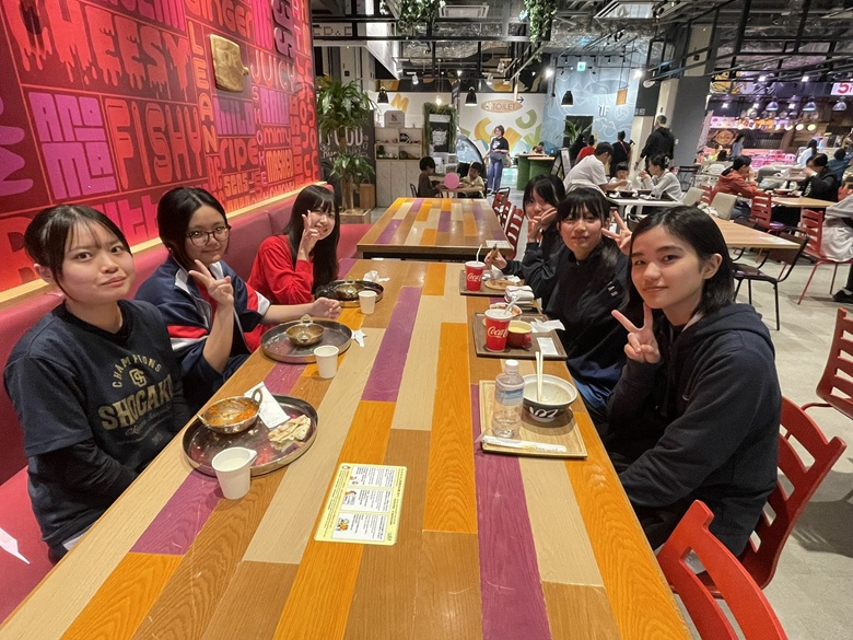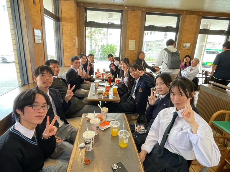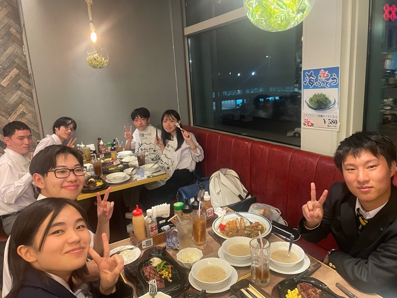 しかし、この交流は学びだけではありません。国際通りでは沖縄尚学の皆さんが“まちぐわー”を案内してくださり、笑顔と笑い声があふれるひとときとなりました。夕食の席では学校生活や将来の夢について語り合い、初日の緊張が嘘のように打ち解け合う姿が見られました。写真には、肩を並べて語り合う様子や、心からの笑顔が広がっています。確実に「仲間」と呼べる存在が生まれた瞬間でした。