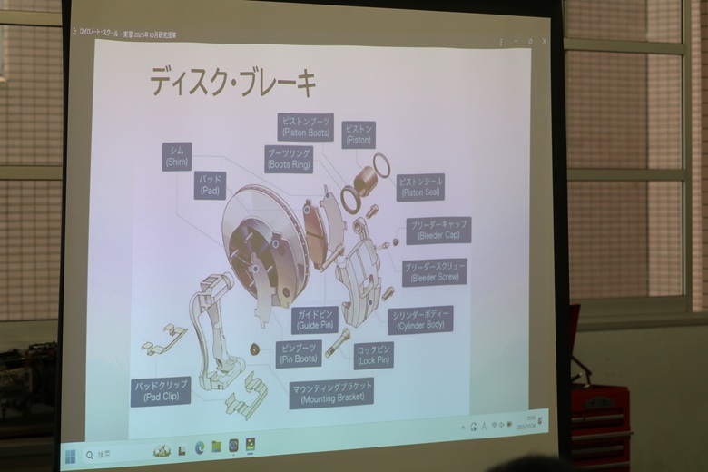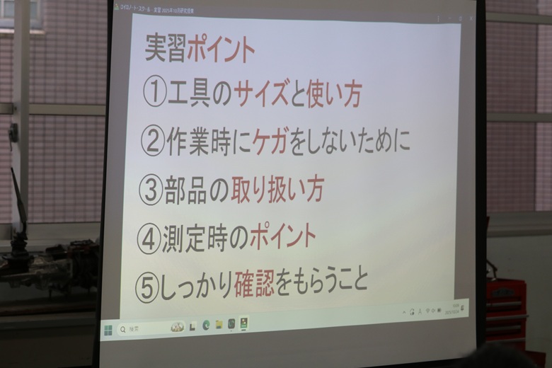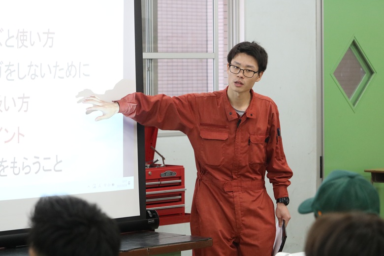 まずは、前回の授業の復習であるブレーキ装置の特徴と実習でのポイントをわかりやすく説明し、安全に作業を行うために服装や工具の使い方などを確認しながら説明していました。