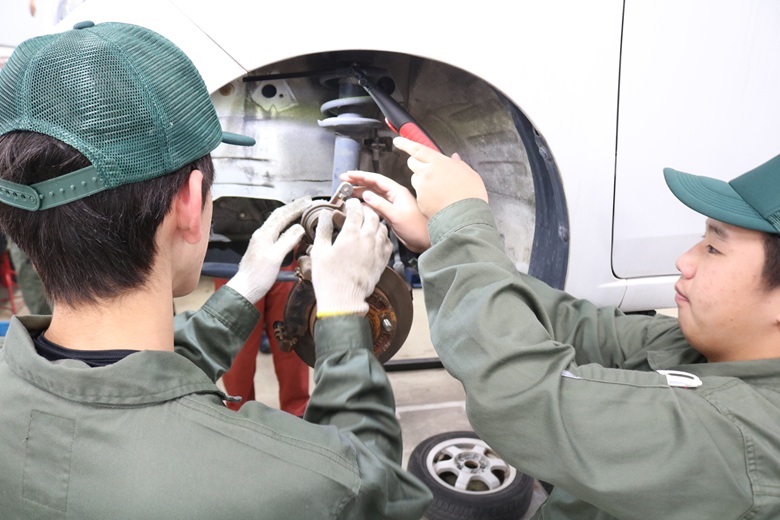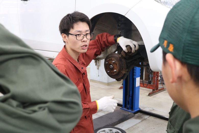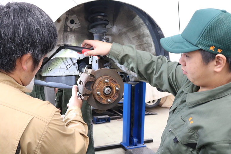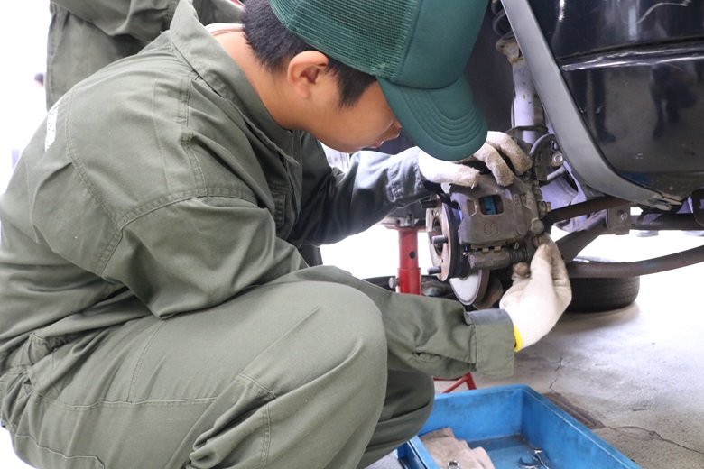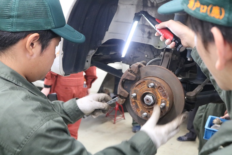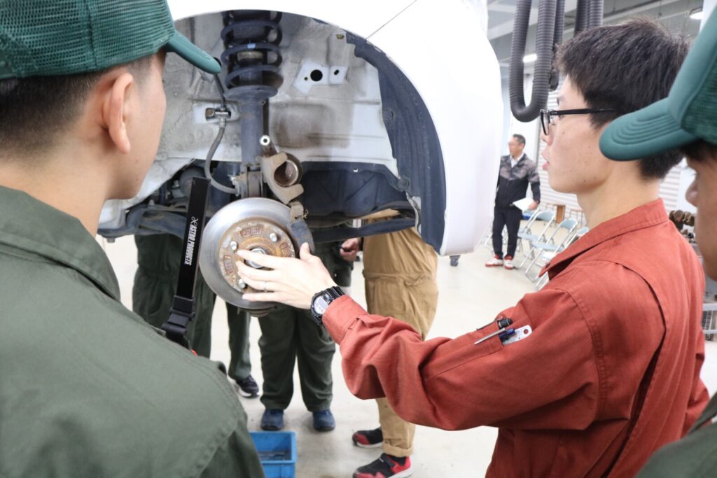 生徒たちは、普段の授業で身につけた知識をもとに、ブレーキ系統の仕組みなどを丁寧に確認しながら作業に取り組んでいました。