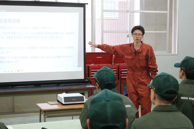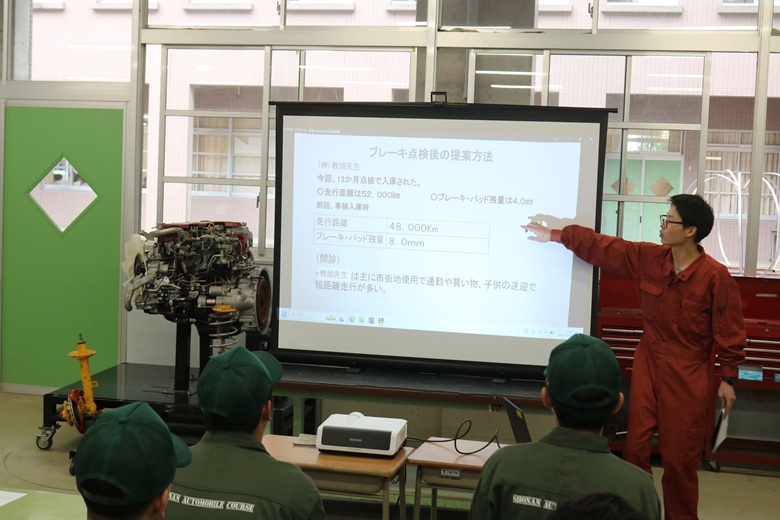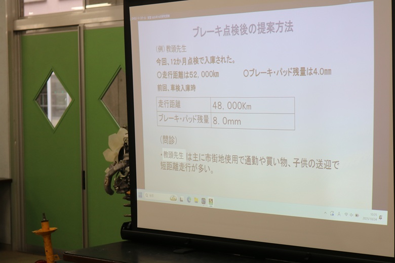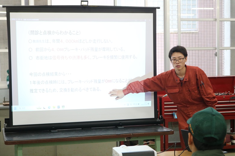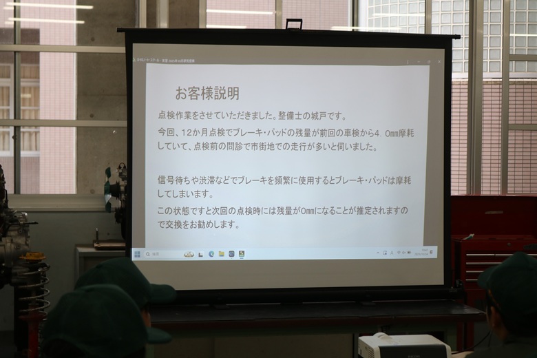 自動車整備士は点検だけでなく部品交換を提案し安心してお客様に車に乗っていただけるよう心がけています。前回と今回の点検にもとづいてお客様に最適な提案ができるように最善を尽くすように生徒に伝えました。