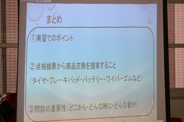 最後に実習ポイントのおさらいをして、しっかりできていたのか生徒に作業を振り返りをしました。点検だけでなく、安全で安心して車に乗っていただくための提案をしっかりとすることをこの研究授業で生徒は理解できたかと思います。