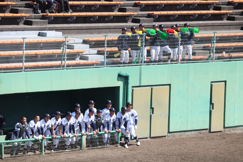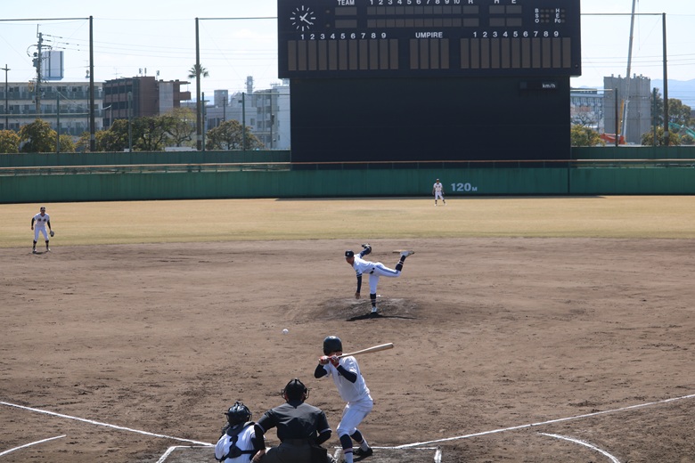 試合が始まると、大学生のスピード、パワー、そして試合運びの巧さなど、普段の高校野球とは違うレベルの高さを随所で感じる展開となりました。それでも本校の選手たちは、持ち前のチームワークと粘り強さで必死に食らいつき、攻守にわたって全力プレーを見せました。球場には緊張感と同時に、「挑戦する高校球児の熱い姿」が広がる時間となりました。