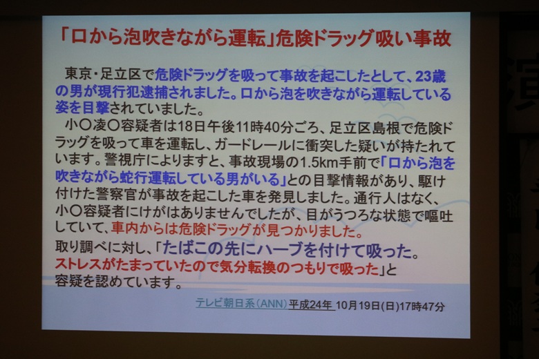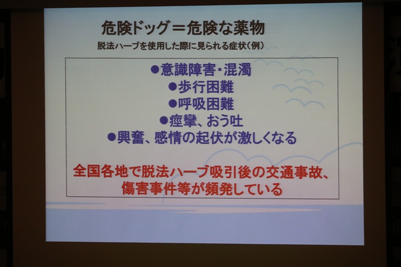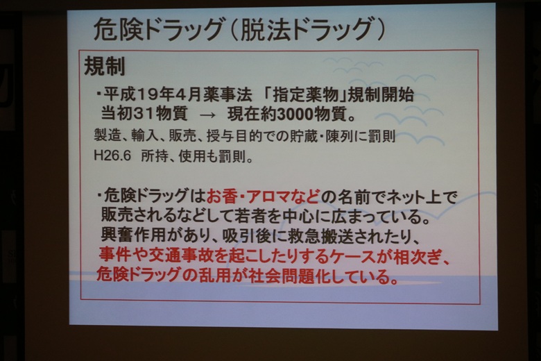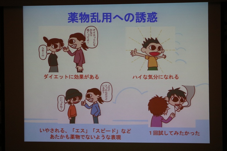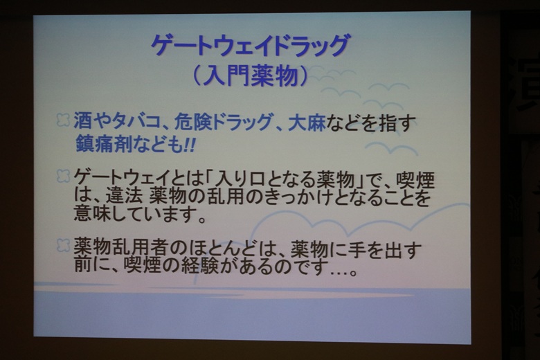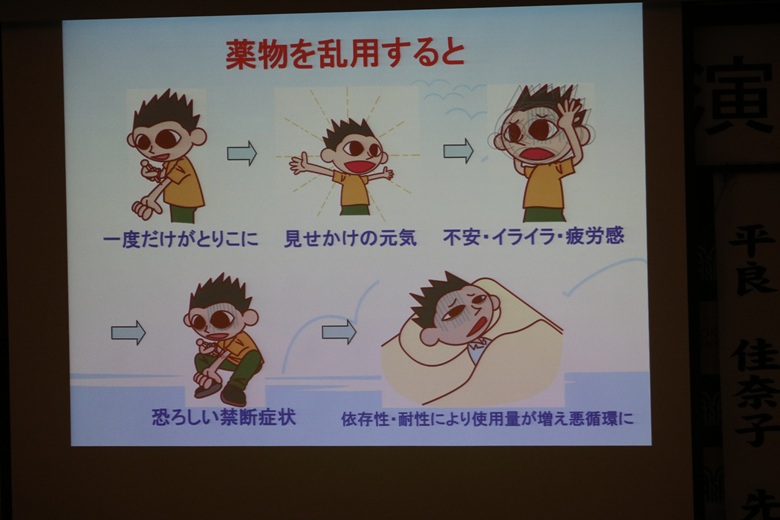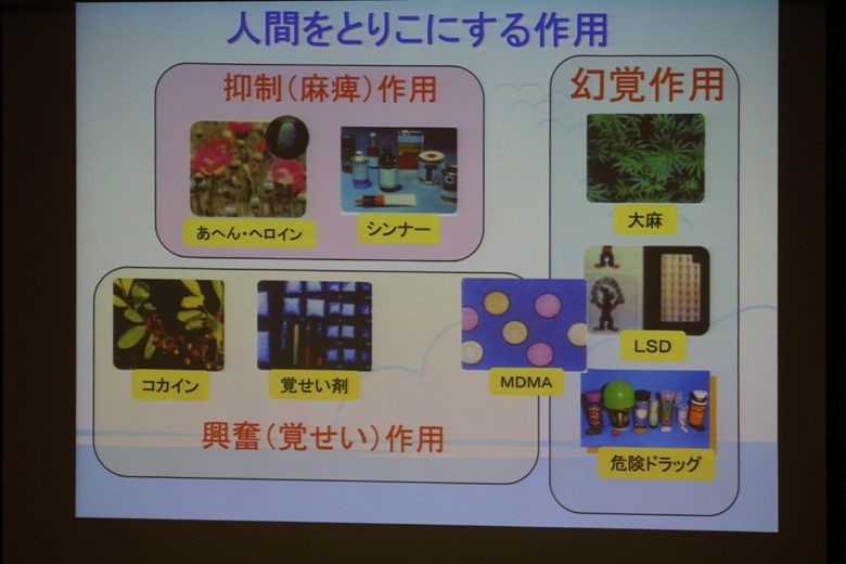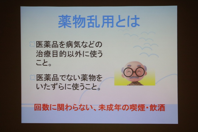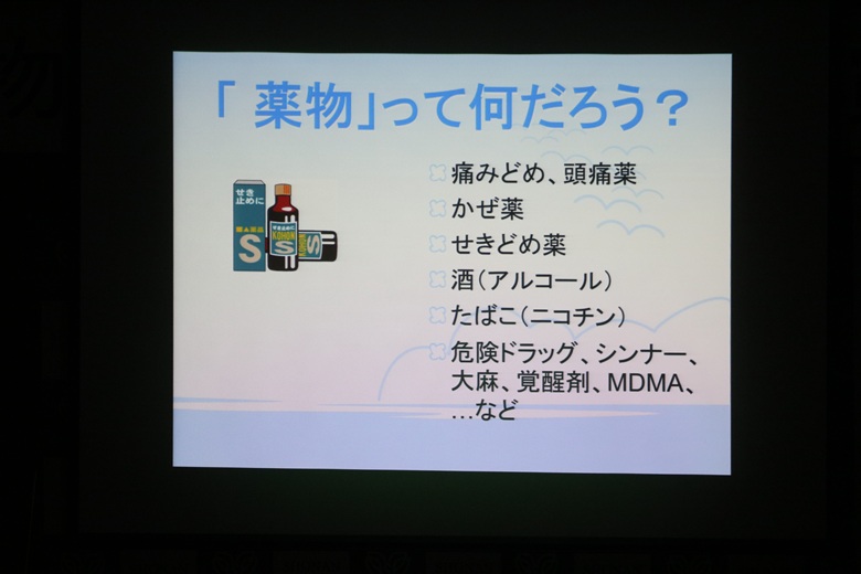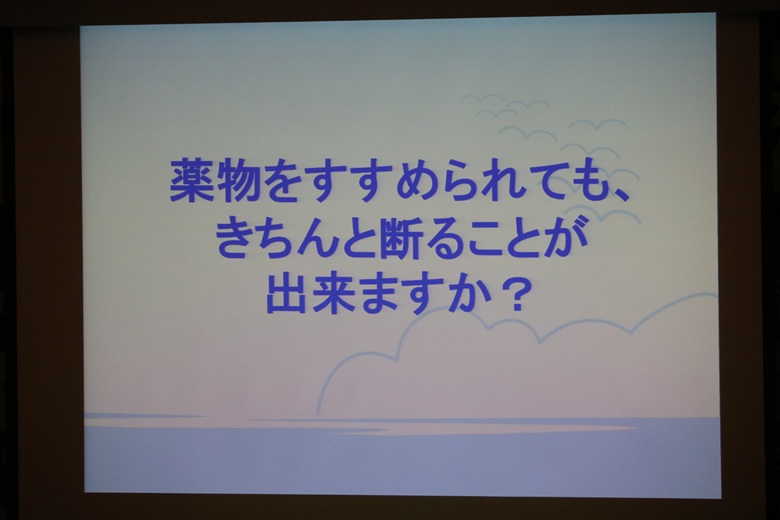 薬物とは、イメージとして”危険を伴うもの”があると思います。アルコールやタバコも該当します。20歳以上でお酒やタバコと付き合うことができますが、間違った付き合い方をすると身体の機能が低下し、楽しい毎日を送ることが難しくなると述べられました。