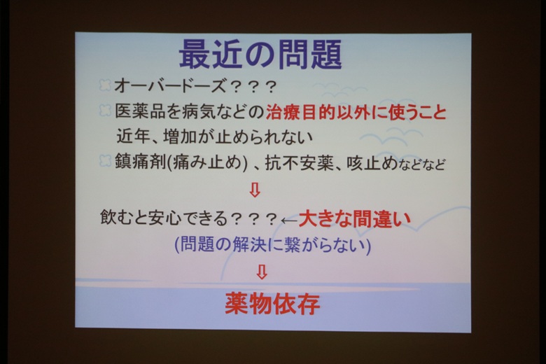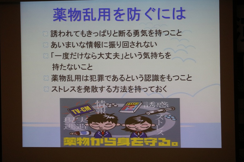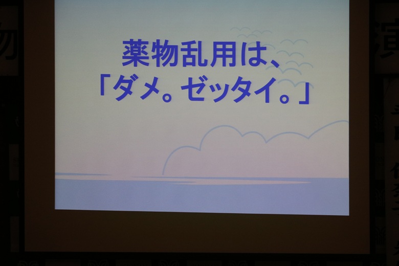講演会全体の締めくくりの中で、学校薬剤師の佐野先生からのメッセージは「身近に薬物がある」という事実と、「断る勇気が大事だ」という点がまとめとして再度強調されました。
