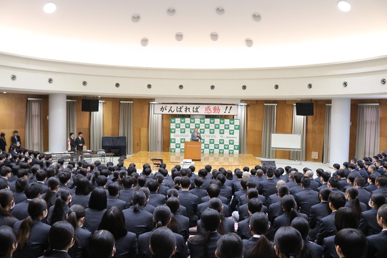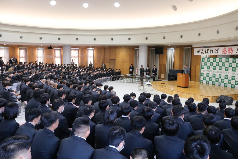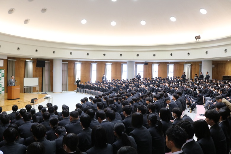 また、大学進学だけでなく就職や専門学校進学など多様な進路があることに触れ、どの道が正しいかを比べるのではなく、自分の選択に誇りを持ち、互いに尊重し合う学校でありたいという思いを示しました。さらに、受験を控える3年生、進路が決まった3年生、そして1年生それぞれに寄り添った言葉を送り、努力を信じること、最高学年としての姿勢、挑戦を恐れない心の大切さを伝えてくれました。