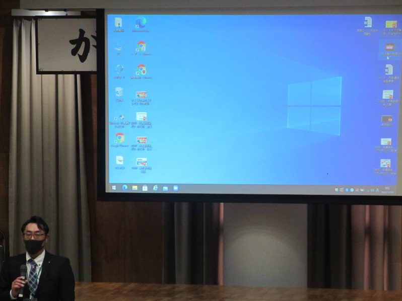 最初は甲南中学校2年生の来校です。多目的ホールに案内後、広報担当の先生より挨拶です。「甲南中学校校区に住んでいます。甲南中学生の中には知っている生徒もいます。見かけたらぜひ声をかけてください。」