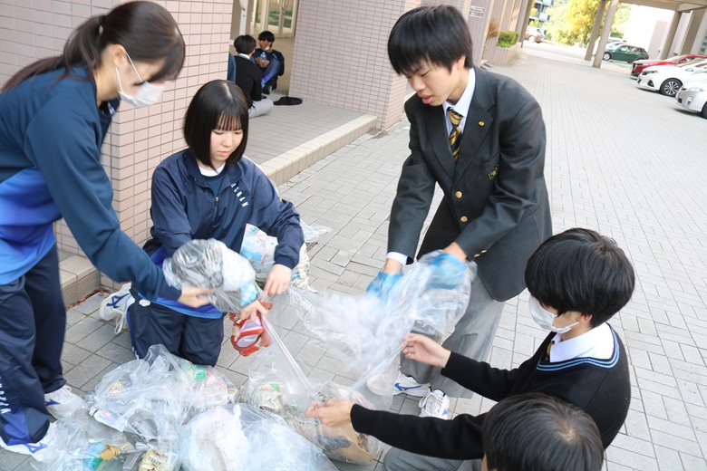 活動が始まると、生徒たちはそれぞれの個性が自然と表れます。資格キャリアコースの生徒たちは、コミュニケーション力を生かして周囲に声をかけながらテンポよく役割分担を決め、機械工学コースの生徒は足元の溝に入り込んだ缶や小石に混じったプラスチック片まで丁寧に取り除いていきます。電気工学コースの生徒は、日頃の観察力の鋭さを発揮して「ここにもあった!」と、皆が見落としそうな場所のごみを次々と見つけていきました。